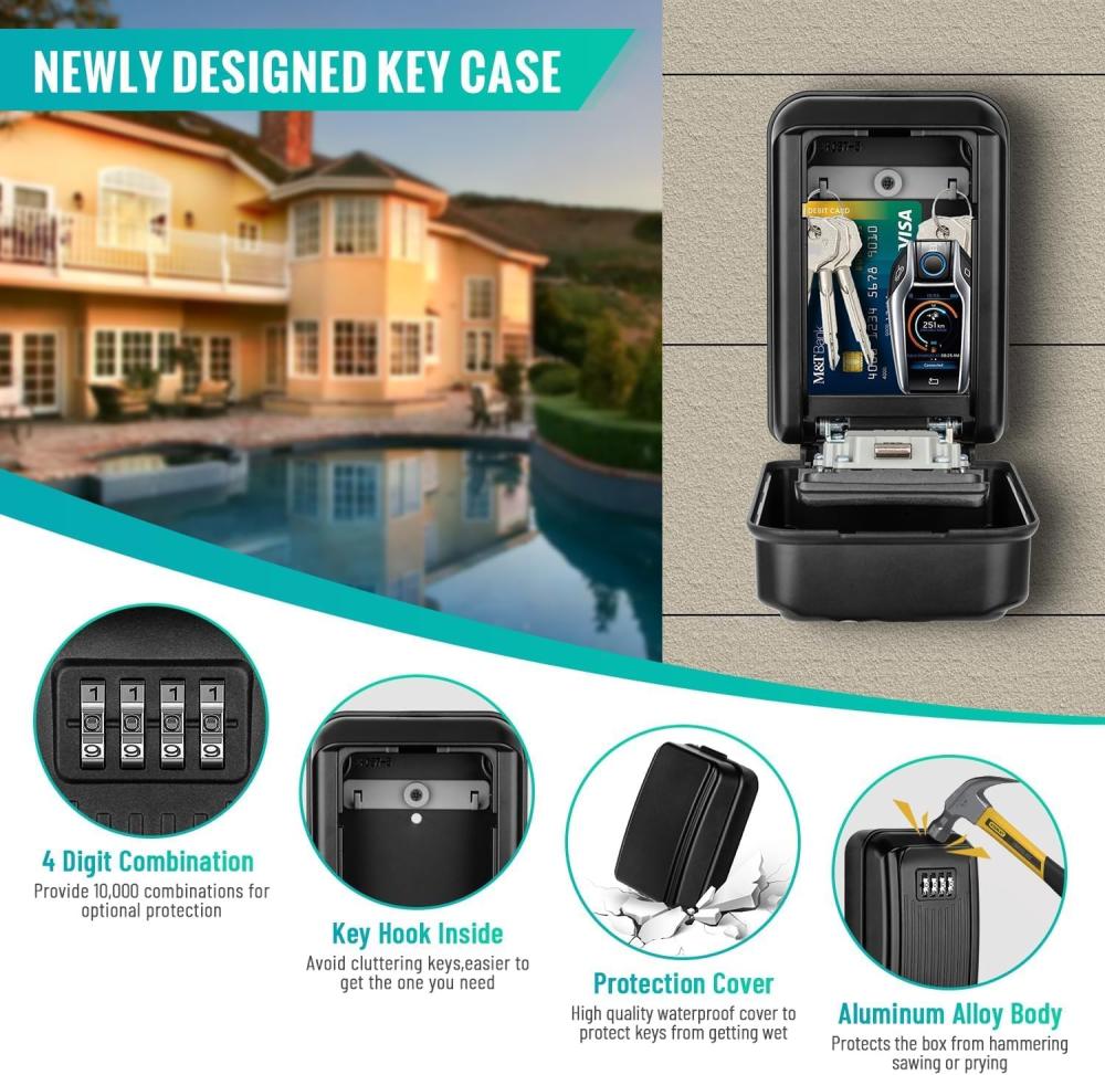 【مجموعة رموز مكونة من 4 أرقام】صندوق قفل للمفاتيح مكون من 4 أرقام قابل لإعادة الضبط يسمح بإعداد رمز كومبو الخاص بك مع 10000 خيار فريد، مما يوفر راحة البال بأن مفاتيحك مخزنة ومحمية بشكل آمن. يرجى ملاحظة أنه بمجرد إعادة تعيين كلمة المرور، من الأفضل التقاط صورة للتسجيل وإلا لن يكون هناك طريقة لفتحها مرة أخرى. تعليمات حول كيفية استخدام خزنة المفاتيح المقاومة للماء سترشدك في كل خطوة وإعادة ضبط رمز الوصول الخاص بك في أي وقت.